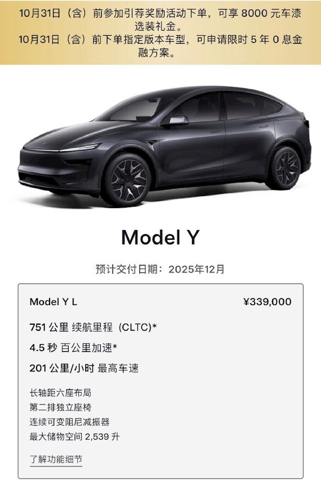 1、即日起至 10 月 31 日(含)前参加引荐奖励活动下单,可享 8,000 元车漆选装礼金。Model Y L 可申请限时 3 年 0 息金融方案